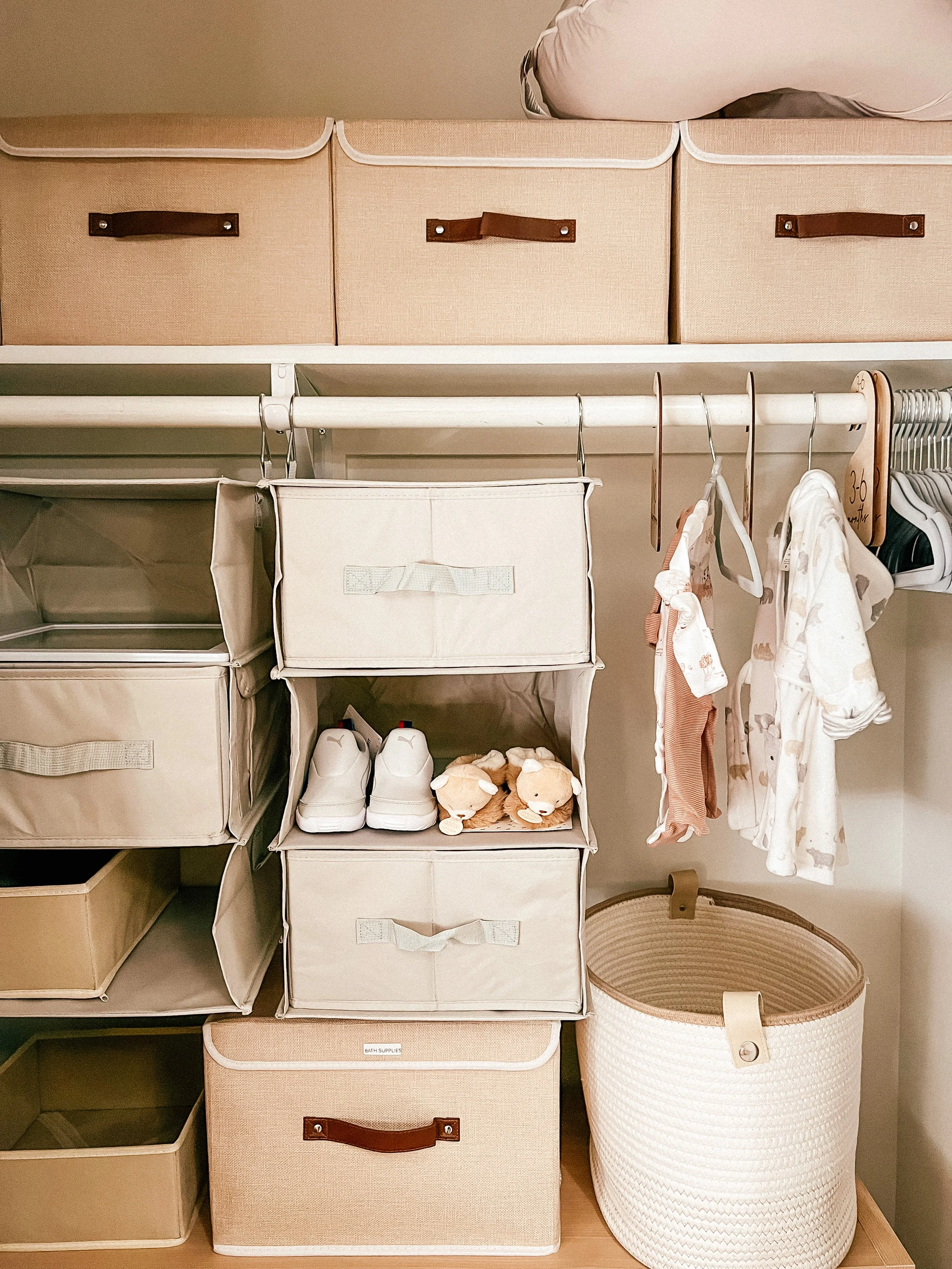 Okay, the closet is still a bit of a work in progress, but I feel like I have a good start on keeping things as organized as I possibly can with the space we are working with. Since we didn’t have much to work with (read: anything) to start in terms of organization goes, this hanging organizer from Amazon and these boxes (what you see at the very top!) were the perfect start to build around in IMO!