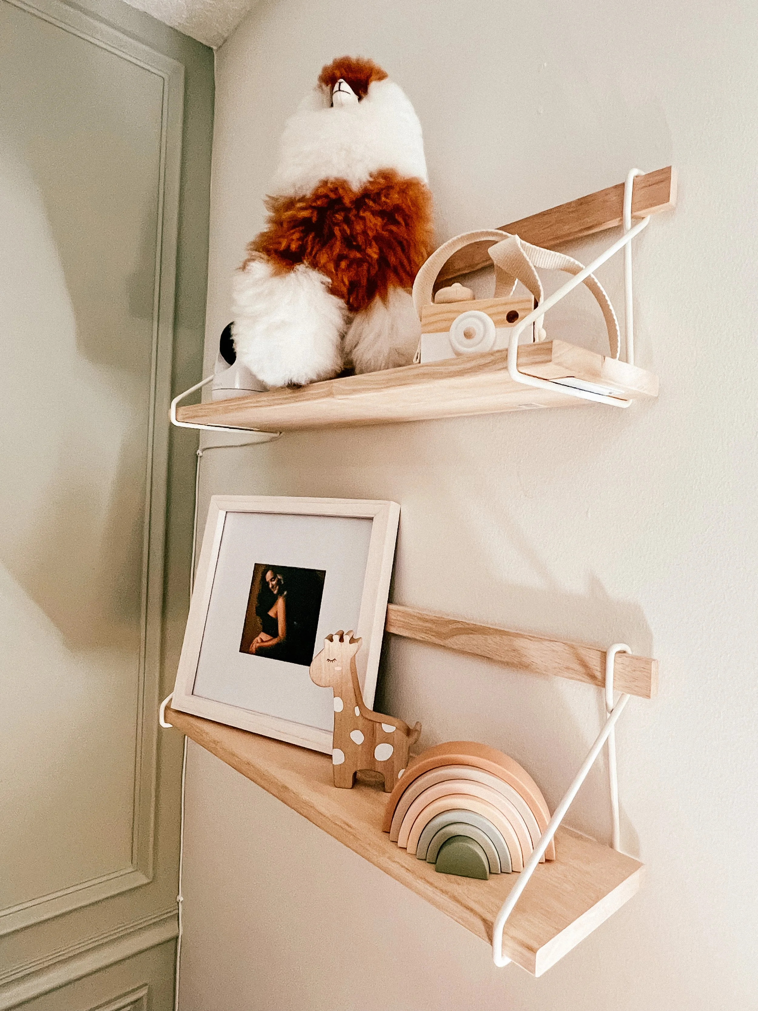suspension shelves // picture frame // rainbow stacking toy // wooden camera // alpaca was a purchase we made on our baby moon in NYC! It is made of real alpaca fur designed and created by women in Peru 🥺